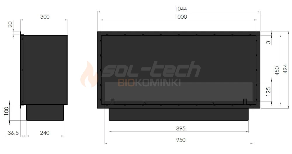 Montaż: Do wbudowania w przelotowy otwór ścienny (w otworze ściennym wymagany jest dodatkowy otwór pod palnik z puszką o wymiarze 895x240x100 mm)