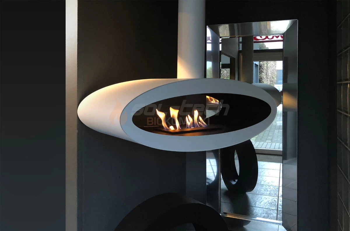 Biokominek wyróżnia się otwartą na przestrzał, dwustronną konstrukcją, dzięki czemu może wisieć nawet w centralnym miejscu pomieszczenia. Tym samym atrakcyjnie prezentuje się jednocześnie z obu stron. Konstrukcja wykonana jest ze stali malowanej proszkowo na kolor czarny półmat termoodporny.
