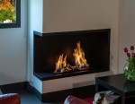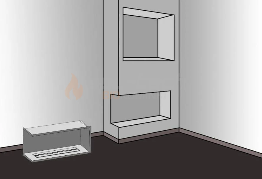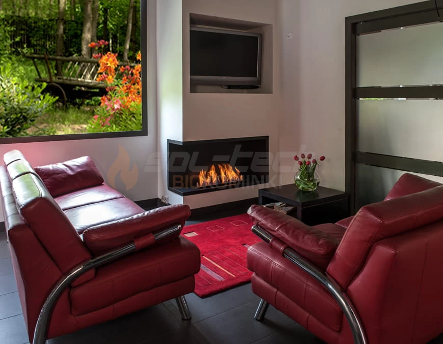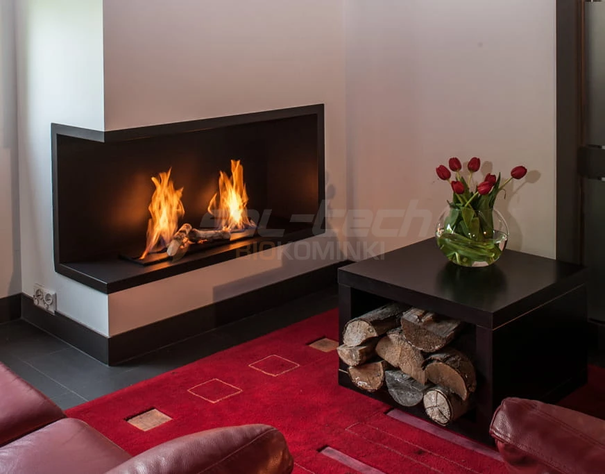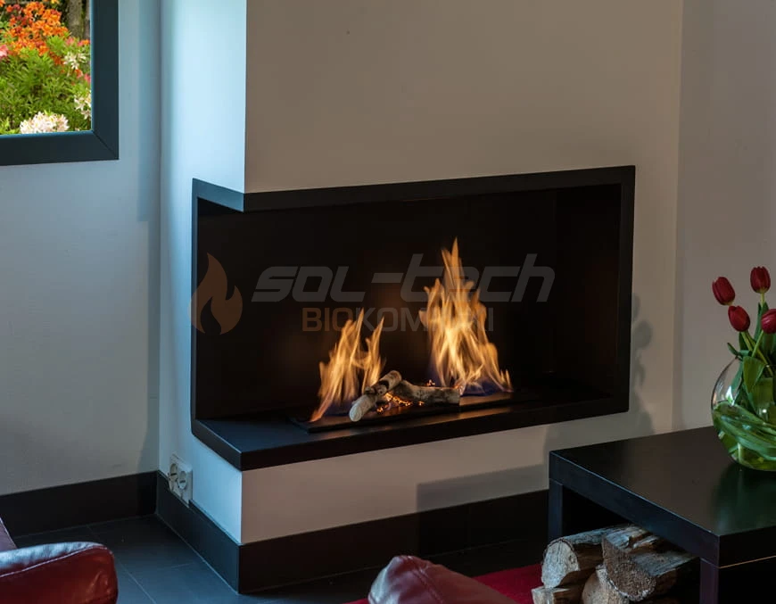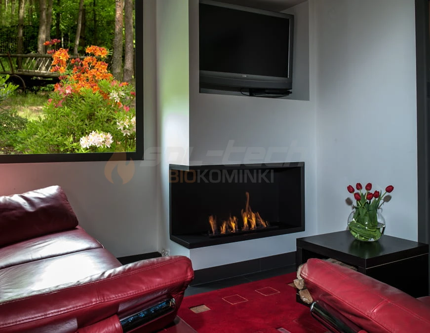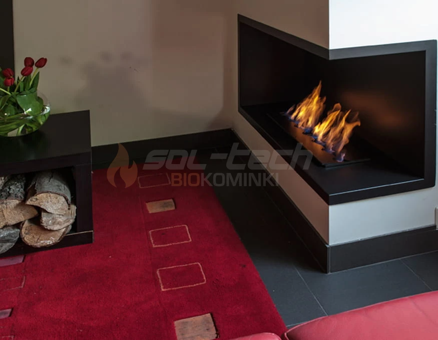 Model Nila to wysokiej jakości biokominek narożny do zamontowania w przygotowanej wnęce, wyposażony w pojemny palnik o kilkugodzinnym czasie palenia i wysokiej mocy grzewczej.