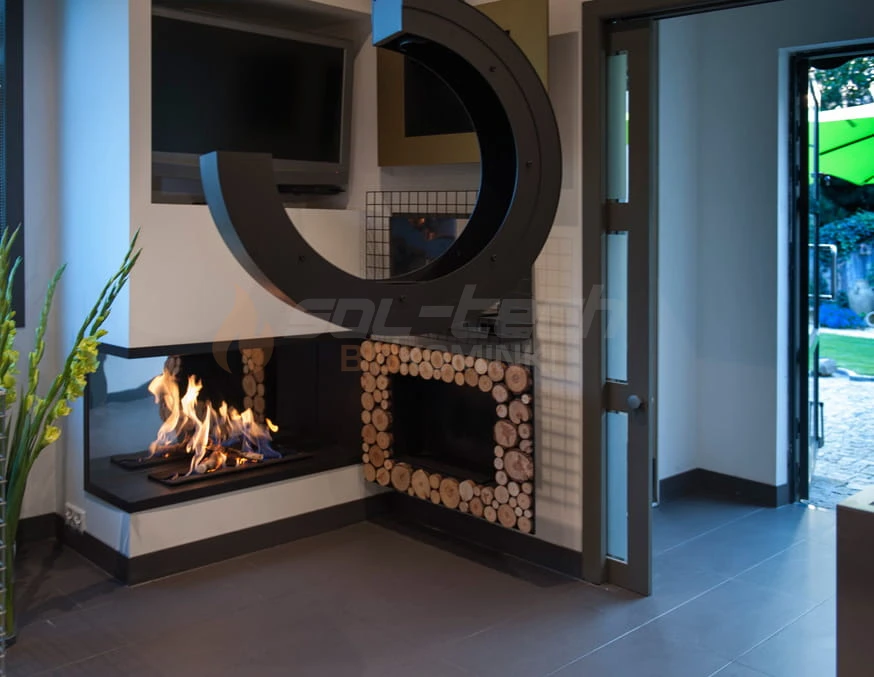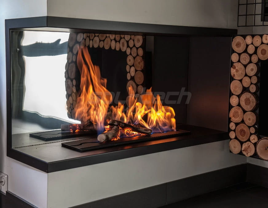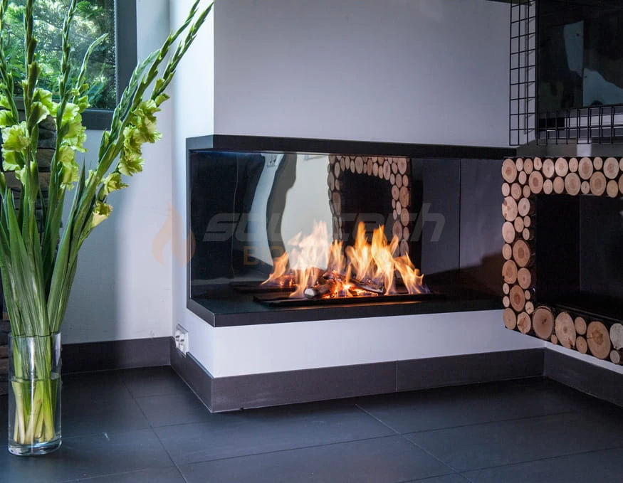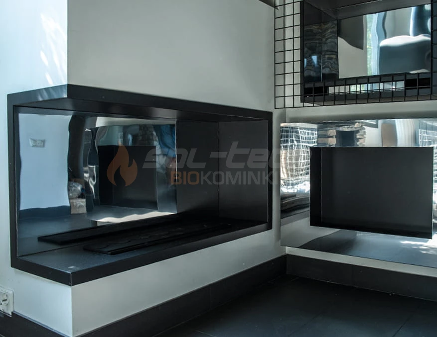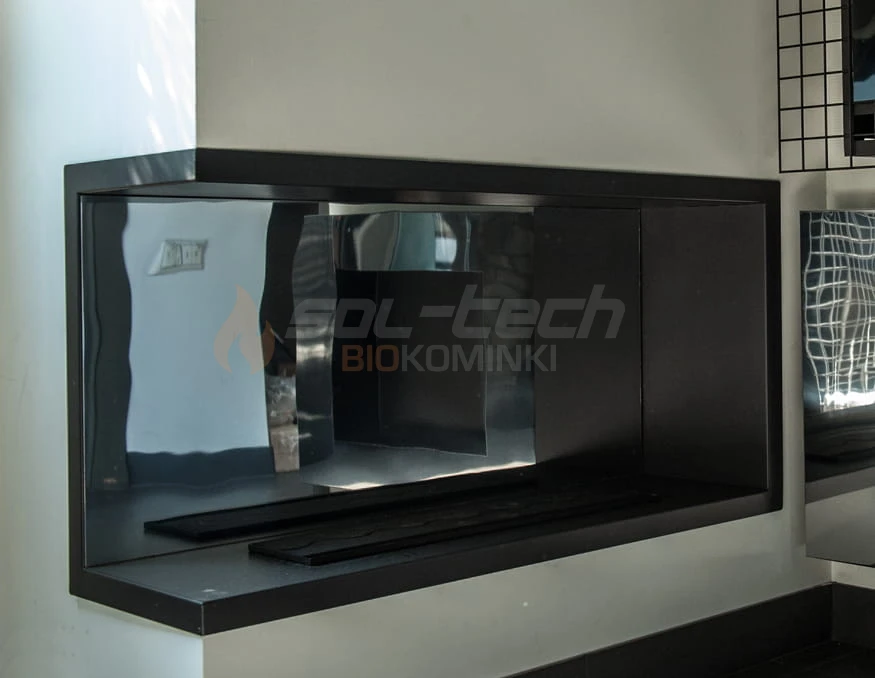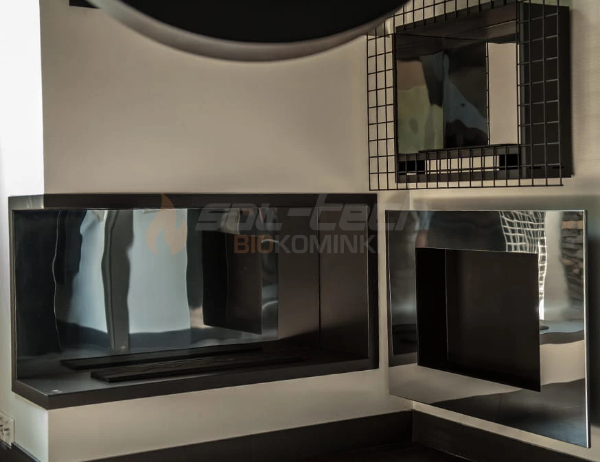 Wnętrze paleniska wykończone jest stalą nierdzewną polerowaną "na lustro", w której (jak w lustrze) odbija się ogień. Dzięki temu rozwiązaniu ogień jest wizualnie jeszcze bardziej obszerny i przestrzenny a kominek nabiera ekskluzywnego wyglądu. Stal lustrzana zamocowana jest na tylnej ściance wnętrza paleniska na długość palnika.
