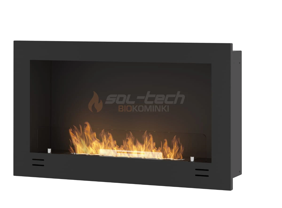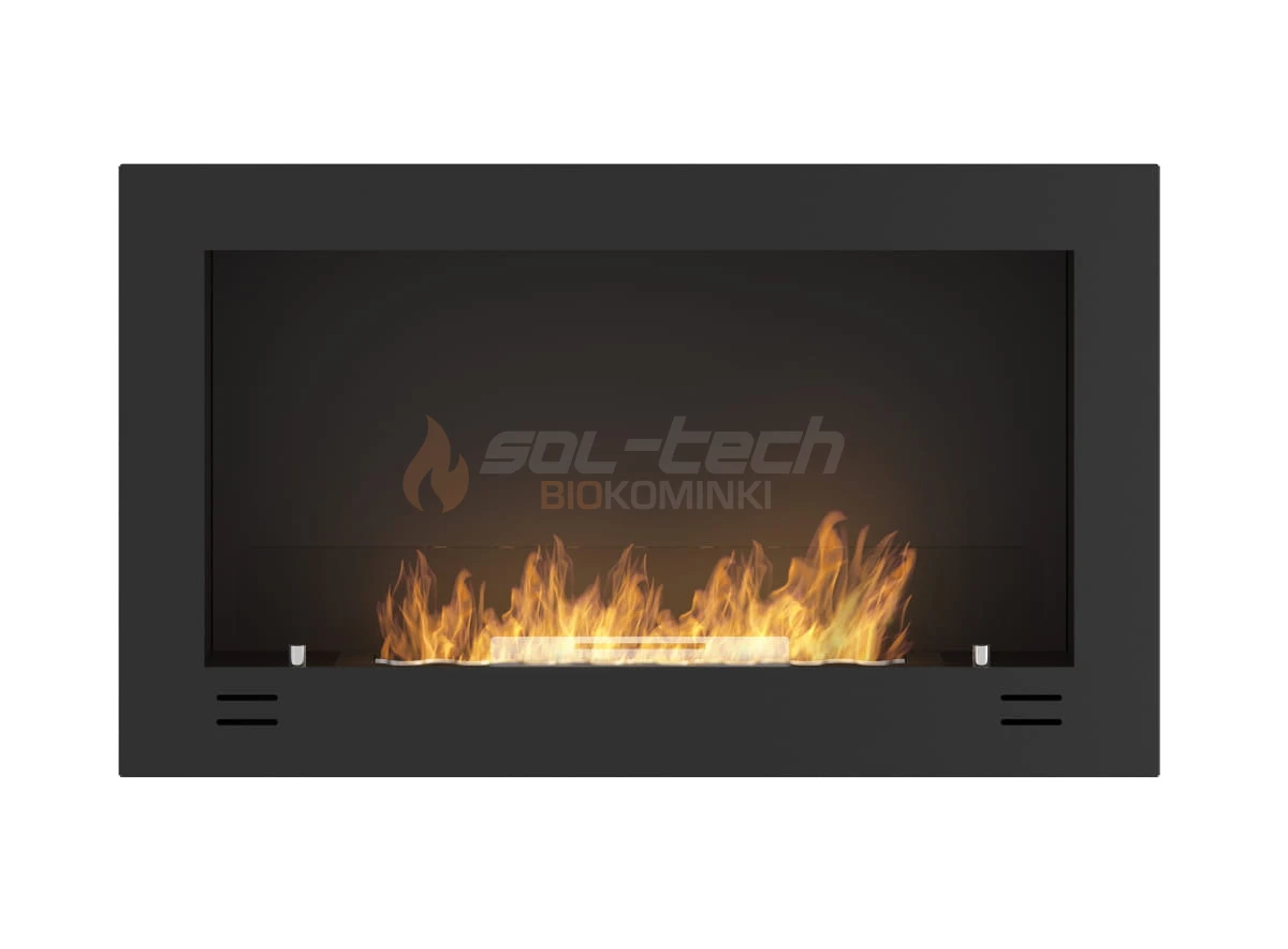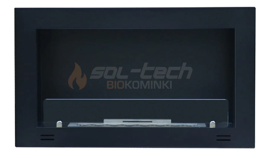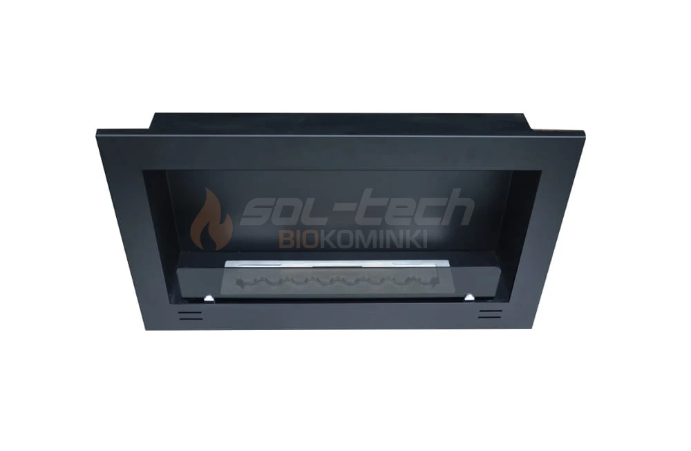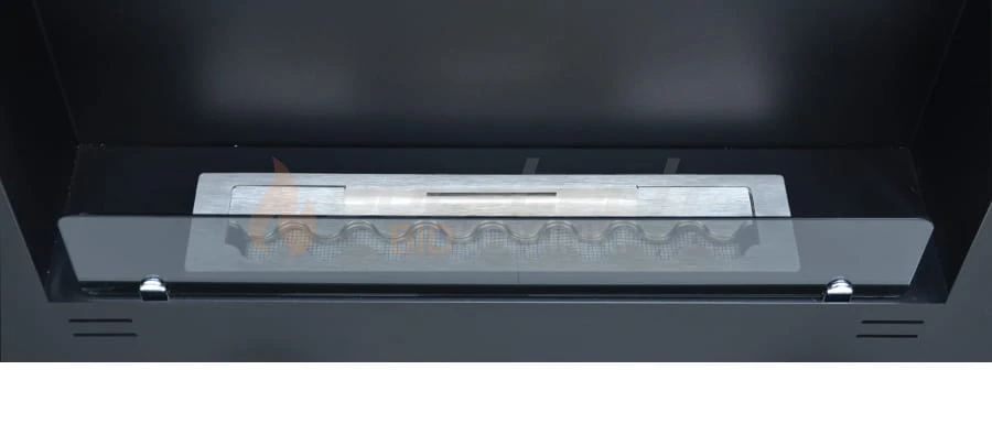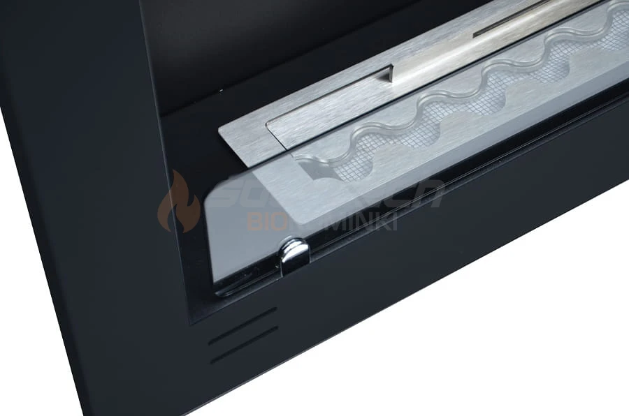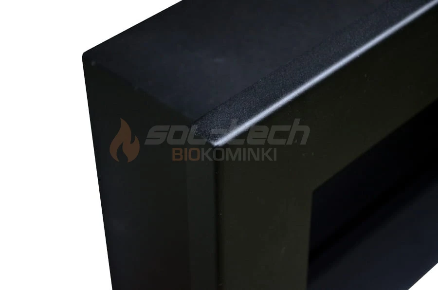 Korpus biokominka wykonany jest z najwyższej jakości stali pokrytej farbą termoodporną w kolorze czarnym matowym z lekko chropowatą strukturą. Cała konstrukcja jest szczelnie zespawana, dzięki czemu daje gwarancję wieloletniej, pewnej eksploatacji i niezawodności. Widoczne na frontowej ramie biokominka cztery podłużne szczeliny wentylują przestrzeń podpalnikową i wyrównują ciśnienie w przypadku wylania się biopaliwa do wnętrza biokominka.