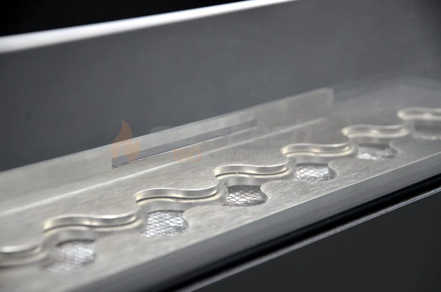 W biokominku New Prometeusz 1 znajduje się wysokiej jakości palnik Fala 500 inox zapewniający długą i efektowną linię dynamicznego ognia o długości ok 45 cm. Palnik wykonany jest w całości z wysokogatunkowej stali nierdzewnej inox, dodatkowo ozdobnie szczotkowanej na górnej powierzchni palnika. Posiada bezpieczną, prostą i niezawodną regulację intensywności płomienia i możliwość szybkiego wygaszenia ognia. Wycinany laserowo, nowoczesny wylot palnika w kształcie fali rozciąga ogień na całej długości, oraz zapewnia bardziej dynamiczną grę płomieni niż w przypadku palników z klasycznym, prostym wylotem.