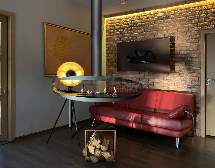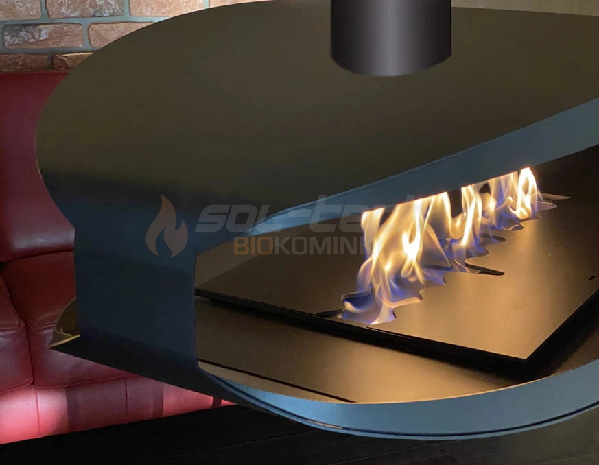 Biokominek wyróżnia się dwustronną konstrukcją, dzięki czemu może wisieć nawet w centralnym miejscu pomieszczenia. Tym samym atrakcyjnie prezentuje się jednocześnie z obu stron. Konstrukcja wykonana jest ze stali malowanej proszkowo na kolor czarny półmat termoodporny.