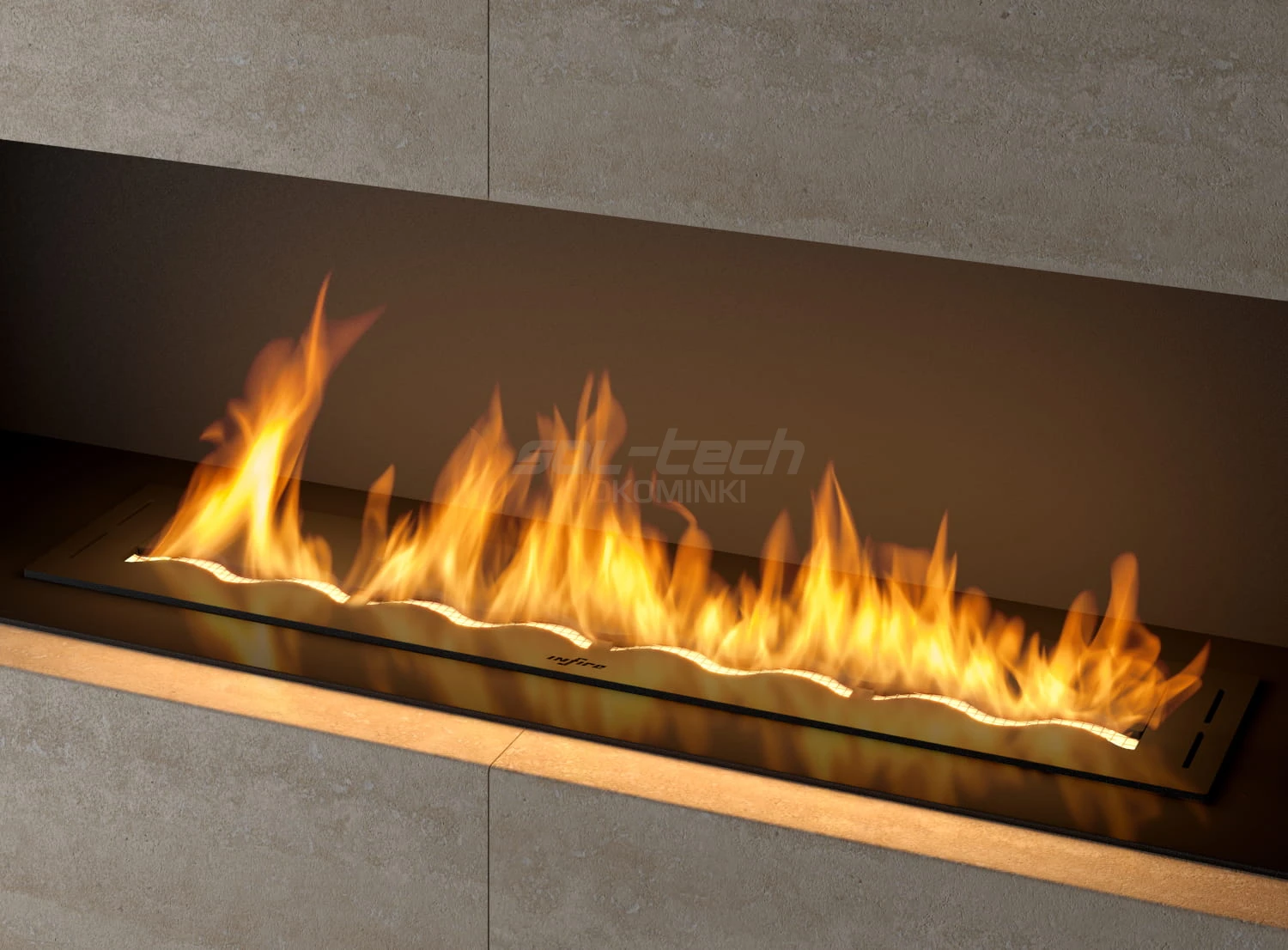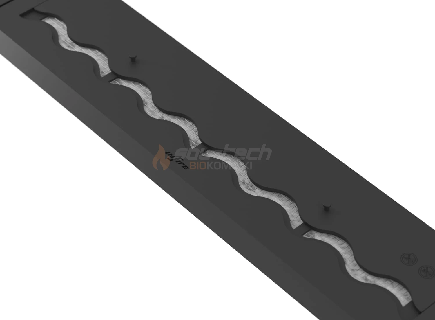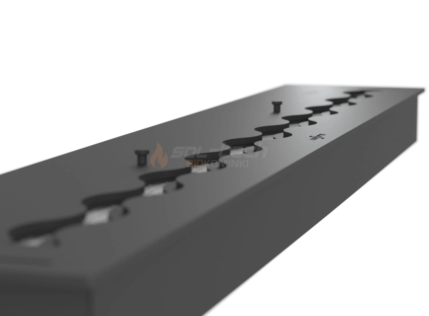 Za precyzyjną regulację wysokości płomieni oraz możliwość wygaszenia palnika w dowolnym czasie odpowiada ruchoma zasuwa w kształcie fali. Falowany wylot rozciąga efektownie płomień na całej szerokości palnika zapewniającym przy tym efekt płomieni 3D.