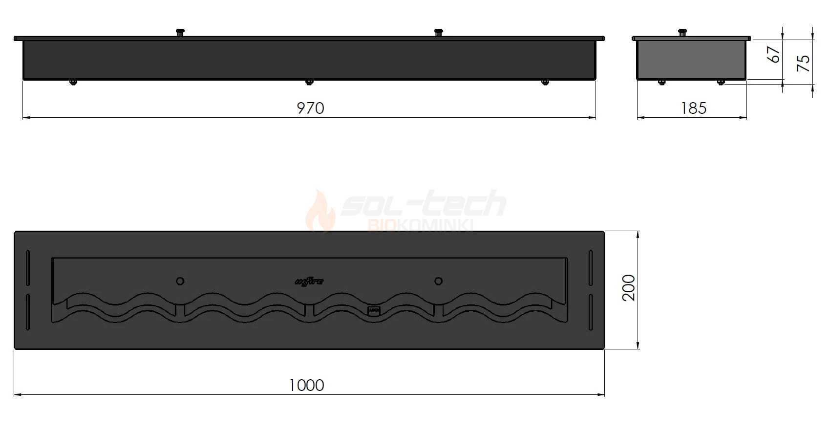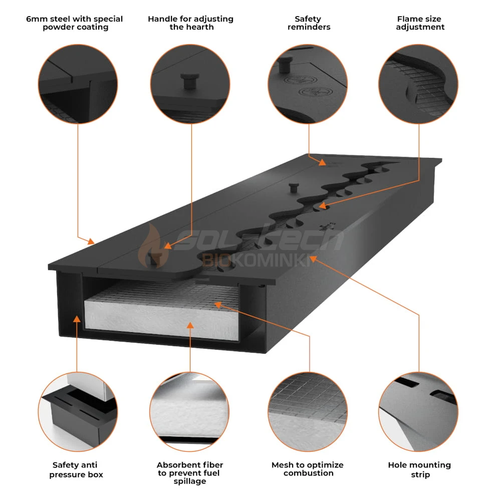 Palnik (wkład) na biopaliwo Slim Line Burner 1000 Black to produkt charakteryzujący się najwyższą jakością wykonania i zapewniający widowiskowy ogień z możliwością regulacji wysokości. Wykonany w całości z wysokogatunkowej stali malowanej farbą termoodporną w kolorze czarnym matowym, z wylotem palnika w kształcie fali. Pojemność palnika wynosi 4 l, dzięki czemu zapewnia możliwość delektowania się widokiem ognia przez nawet do 5 h.