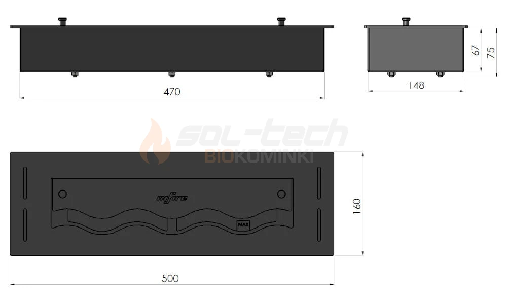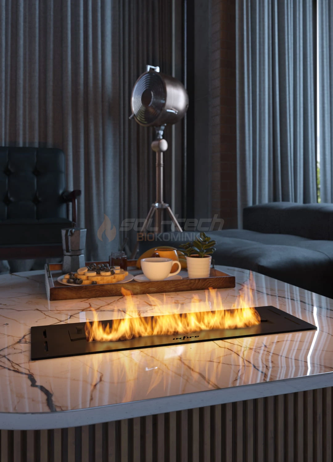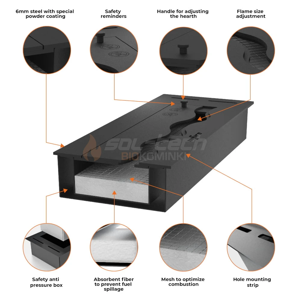 Palnik (wkład) na biopaliwo Slim Line Burner 500 Black to produkt charakteryzujący się najwyższą jakością wykonania i zapewniający widowiskowy ogień z możliwością regulacji wysokości. Wykonany w całości z wysokogatunkowej stali malowanej farbą termoodporną w kolorze czarnym matowym, z wylotem palnika w kształcie fali. Pojemność palnika wynosi 1 l, dzięki czemu zapewnia możliwość delektowania się widokiem ognia przez nawet 2,5 h.